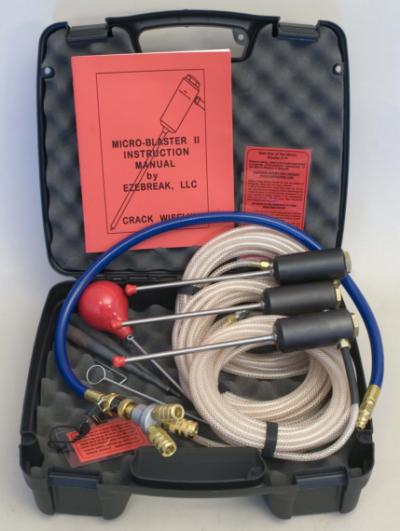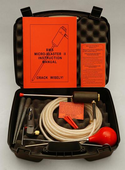 The durable molded case measures 15" x 12" x 6" and contains the Micro-Blaster II, a bore brush and bulb blower (for cleaning drilled holes), 2 tapered pins (for wedging apart cracked material), a CO2 bicycle inflator (for pressurizing the system), and instructions for safe use.