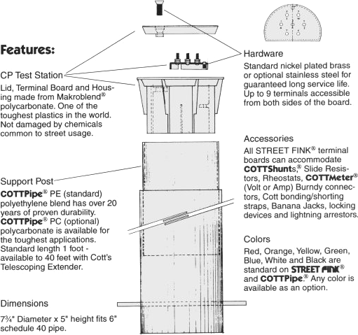 The Street Fink® cathodic protection test station is a non-conductive, high capacity, flush mounted, below ground terminal that is used to conveniently monitor electrical currents and potentials associated with all types of underground piping, cables, and other metallic structures. Designed especially for use in troublesome locations where water, street traffic and other adverse conditions exist, the Street Fink® will maintain its structural integrity during hard usage and is suitable for installation in asphalt. In stock and ready for immediate delivery from Northtown Company.